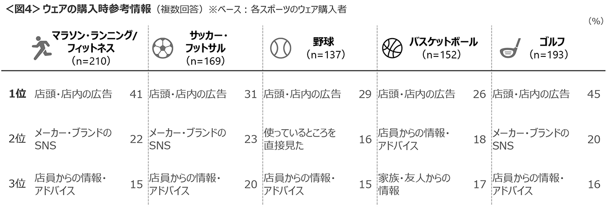 購入時の参考情報は、店頭購入率が高いことから「店頭・店内の広告」「店員からの情報・アドバイス」が高い。マラソン・ランニング/フィットネス、サッカー・フットサル、ゴルフでは、「メーカー・ブランドのSNS」が2番手にあがった。<図4>