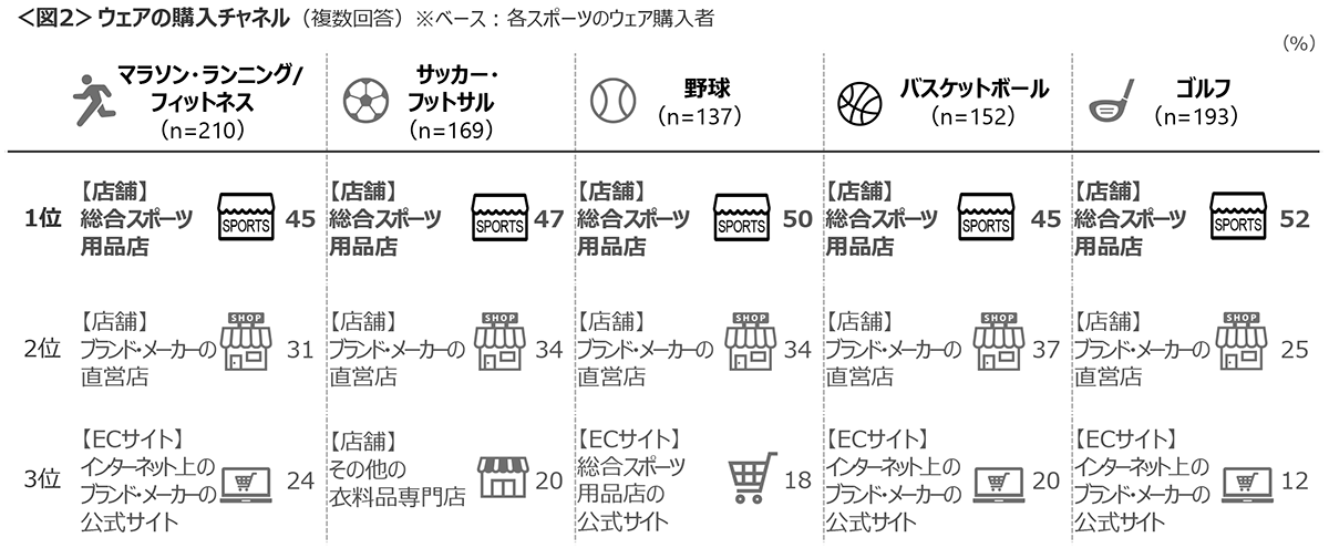 ウェアの購入チャネルは、いずれのスポーツも「総合スポーツ用品店(店舗)」がトップで40~50%台、次いで「ブランド・メーカーの直営店(店舗)」が20~30%台であり、店頭での購入率が多い。<図2>