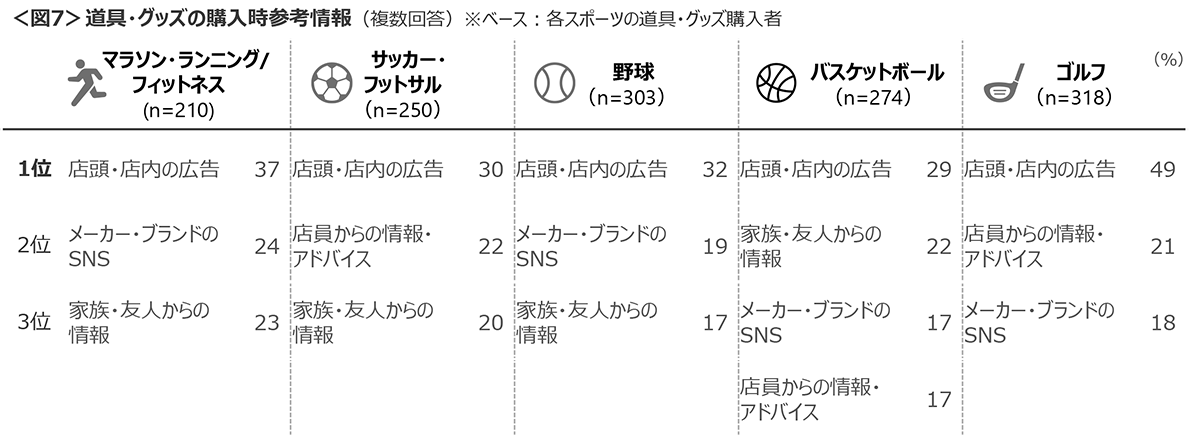 購入時の参考情報は、「店頭・店内の広告」がすべてのスポーツで1番手。2~3番手に「店員からの情報・アドバイス」「メーカー・ブランドのSNS」「家族・友人からの情報」があがる。<図7>