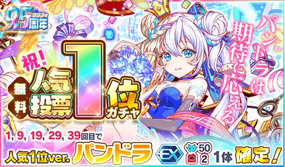 9.5周年記念キャンペーン第3弾では、ついに極フィーバーフェスに新ユニット『渉起の対現戦線 イーディス&アリス』が登場!そしてイベント『あけおめことよろ☆蛇の道攻略』を開催!また9周年で実施した人気投票で最推しユニット1位を獲得した『パンドラ』の新 ver.が必ずゲットできる無料チケットガチャも開催!