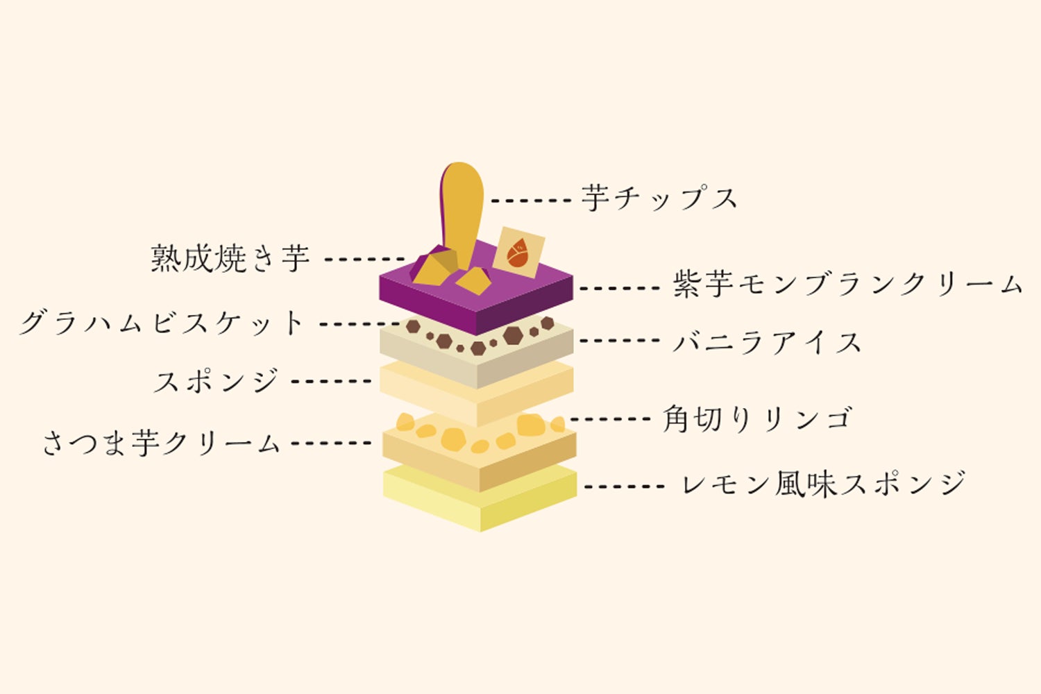 升(ます)の中で何層にも重なったアイスモンブラン。異なる種類のスイートポテトの甘さが、果実の酸味と相まって口の中に広がります。様々な食感が一度に楽しめる、秋の味覚の贅沢スイーツです。