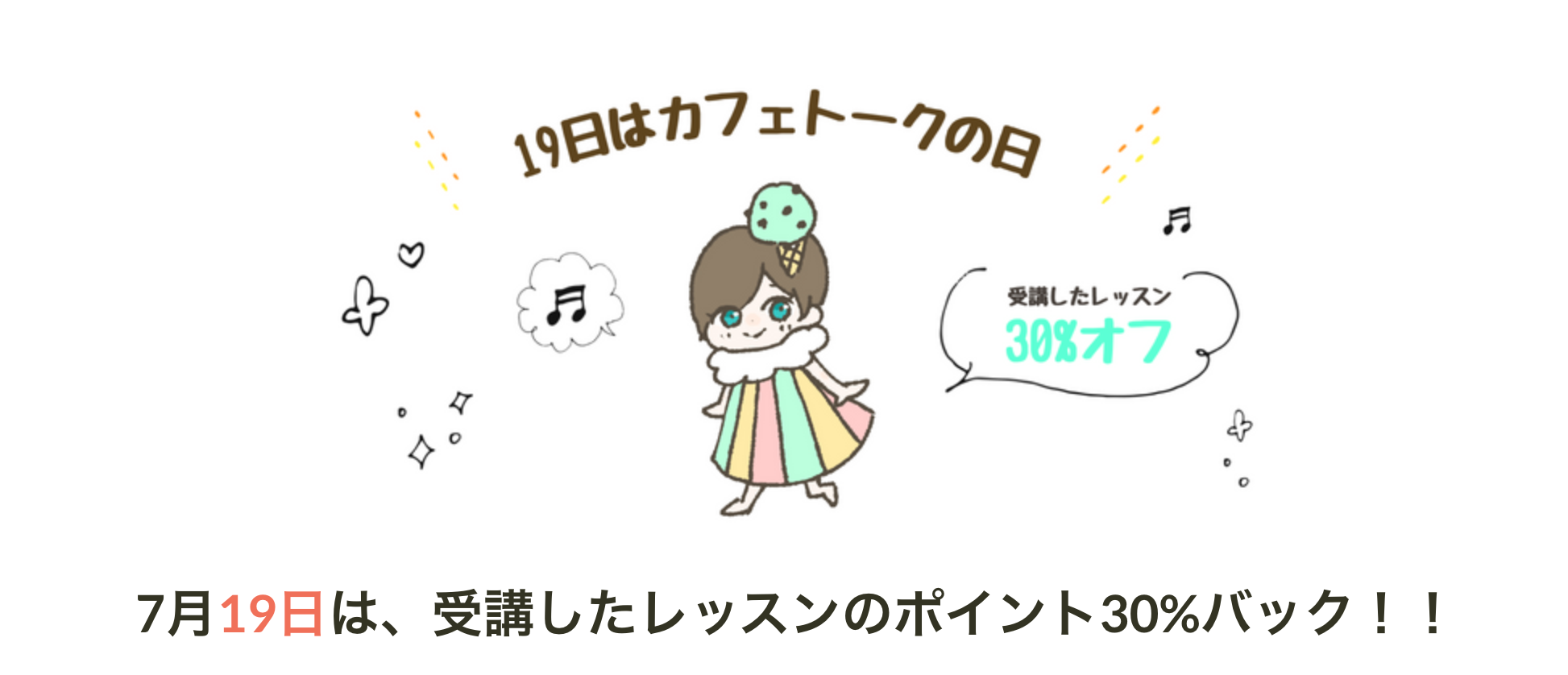 - 「カフェトークの日」とは、日本最大級オンライン習い事サイト「カフェトーク」が毎月19日と29日に実施している30%ポイントバックキャンペーンです。