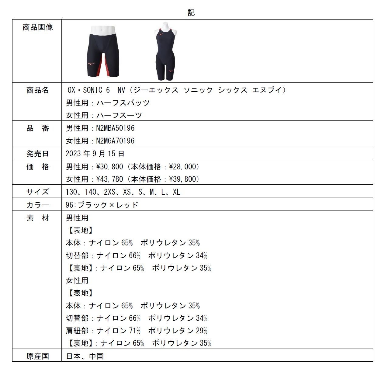 ミズノは、世界水泳連盟(World Aquatics)承認のトップ選手向け競泳用水着「GX・SONIC 6(ジーエックス ソニック シックス)」を全国のミズノスイム品取扱店、ミズノ公式オンラインで9月15日から順次発売します。
