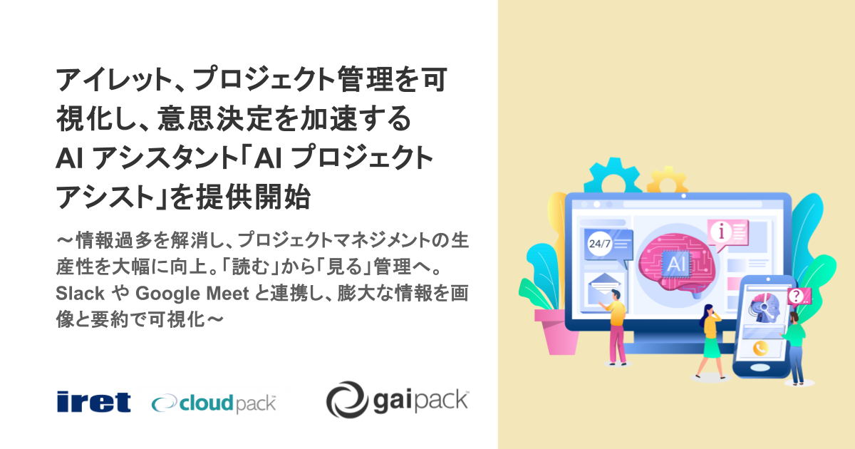 システム・アプリケーションの開発からインフラ構築・運用までをワンストップで提供するアイレット株式会社(本社:東京都港区、代表取締役社長:岩永充正、以下 アイレット)は、企業の AI 活用を支援するソリューション群「gaipack(ジーエーアイパック)」の新ラインナップとして、 プロジェクト進行における状況把握や議事録作成を自動化する「AI プロジェクトアシスト」を本日より提供します。