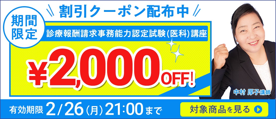 【期間限定】診療報酬請求事務能力認定試験(医科)講座 誰でも使えるクーポン 配布中!