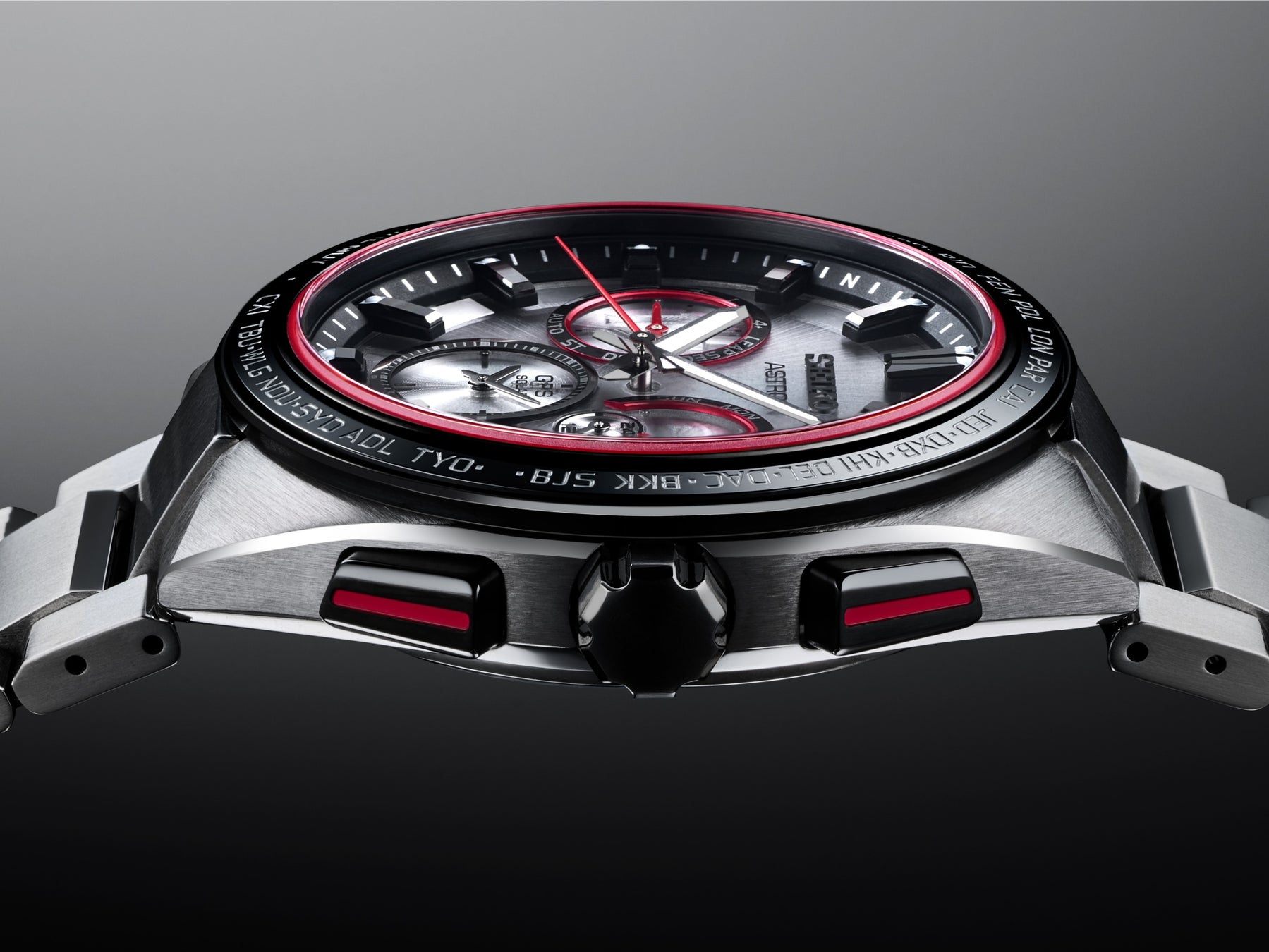 カン足を大胆にそぎ落とし、着け心地の良いソリッドな造形を追求することで、洗練されたスポーティデザインに仕上げました。ケース、ブレスレットには軽量で錆びにくいチタン素材を採用し、快適な着け心地を実現しています。ボタンの側面にも、チームカラーの赤色がさりげなくあしらわれています。
