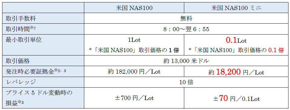 - 「米国NAS100」と「米国NAS100ミニ」のサービス概要比較