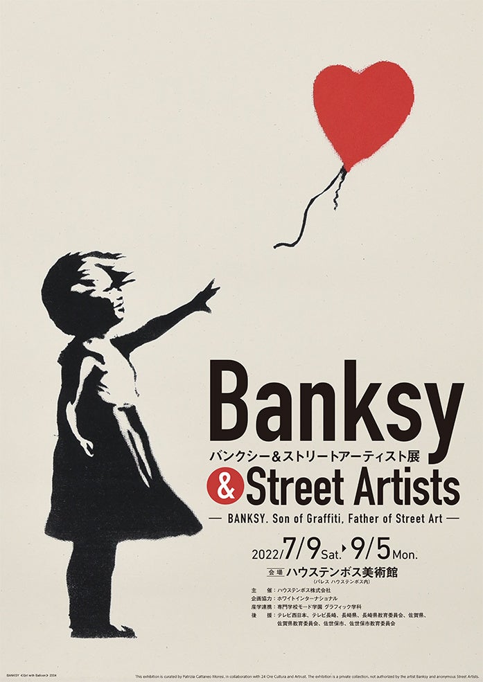 | 「バンクシー&ストリートアーティスト展~バンクシー グラフィティの申し子、ストリートアートの父~」 会期:2022年7月9日(土)~9月5日(月)(59日間) 時間:9:00~18:00(ハウステンボスの営業時間により変動あり) 料金:パスポートをお持ちの方、年間会員パスポートは無料 会場:ハウステンボス美術館 主催:ハウステンボス株式会社 企画協力:ホワイトインターナショナル 産学連携:専門学校モード学園 グラフィック学科 後援:長崎県、長崎県教育委員会、佐賀県、佐賀県教育委員会、佐世保市、佐世保市教育委員会、テレビ長崎、テレビ西日本 |