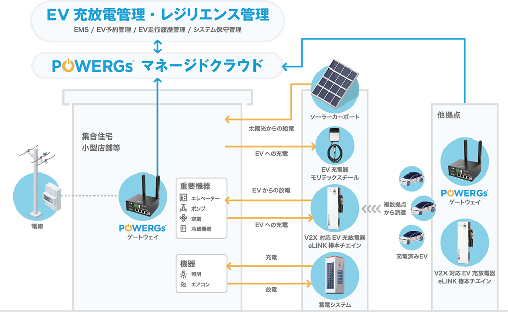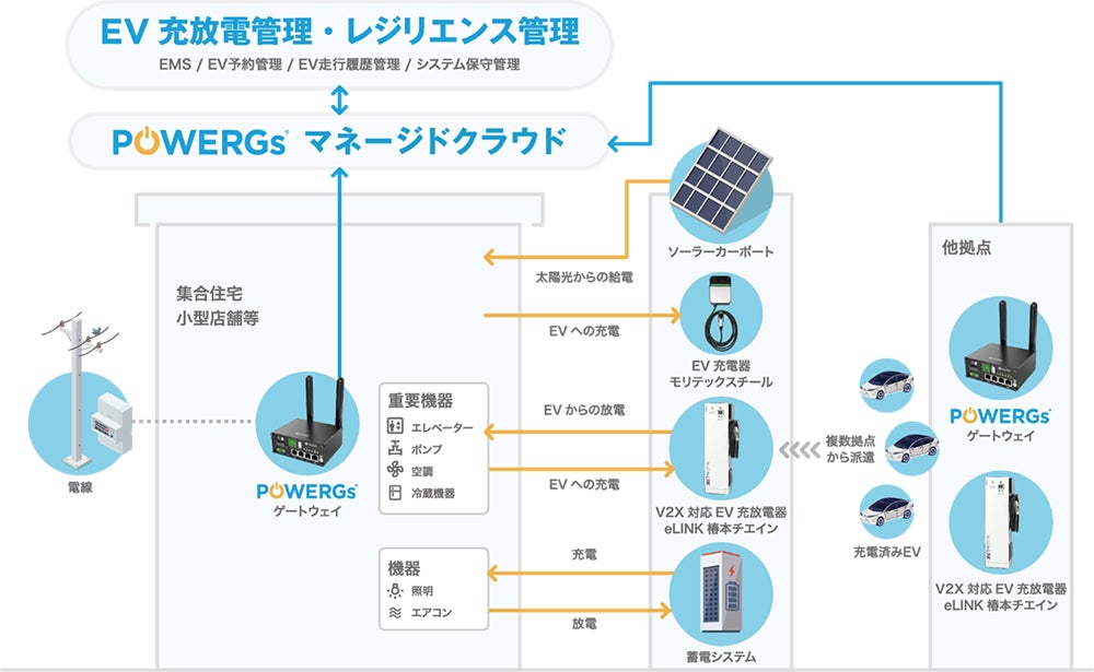 「POWERGs 脱炭素デジタルパック for EVグリッド」は、従来の「POWERGs 脱炭素デジタルパック」にEVの充放電機能をスマートグリッドに統合し、EVの電源としての活用を可能にするパッケージです。建物の電力網にEV用電池をつなげ、平時の際のEVへの充電だけでなく、有事の際にEVを電源として利用することで施設のレジリエンス機能を強化します。地震等の災害時に施設内のエレベータや防災設備等の電力系統がダウンした際、駐車中のEVより放電し電力を供給することで、早期の停電復旧が可能となります。