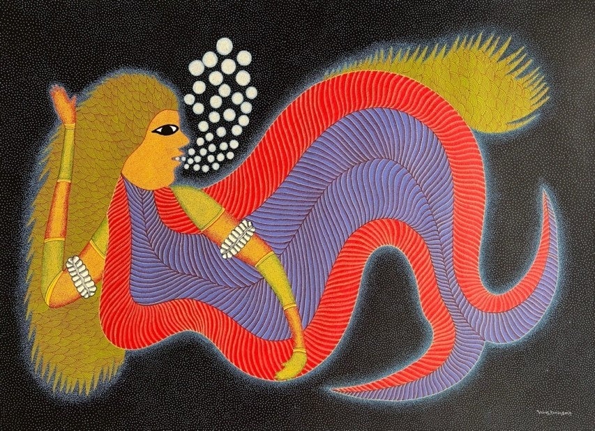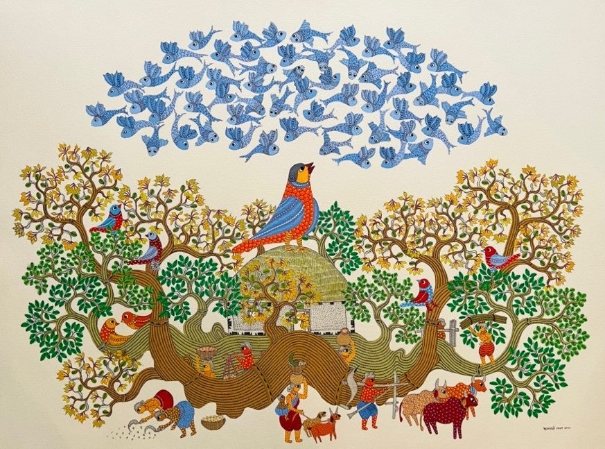 ゴンド・アートのモチーフは、想像上の生きものを含めた動植物、村の日常生活、神話や寓話など、民族の思想や暮らしと密接に関係しています。豊かな発想と大胆な構図、ときにユーモラスにも感じられる表現、そしてモチーフのなかに敷き詰められる細かく美しいパターン模様と鮮やかな色彩のコンビネーションが見どころです。民族画の中でも画家の個性が感じられ、モダンな魅力を併せもつゴンド・アートは近年世界中で注目を集めています。