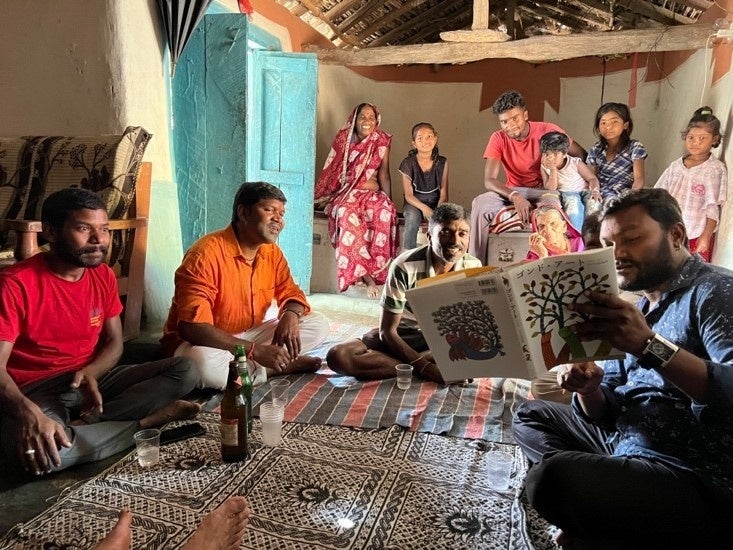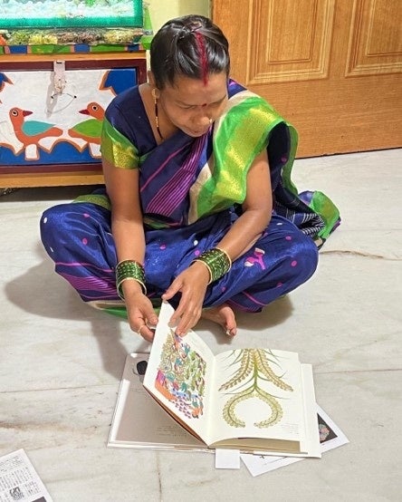 Touch the GONDは、コロナ禍以来ようやく7月にインドへ行き、画家たちに直接画集を手渡すことができました。日本語で紹介されている本を手にして喜び、また、1ページ1ページを興味深そうに眺めていたのが印象に残っています。画家たちが、コロナ禍の期間に描き溜めていた選りすぐりの作品や本展覧会のために制作した作品を託され、持ち帰りました。