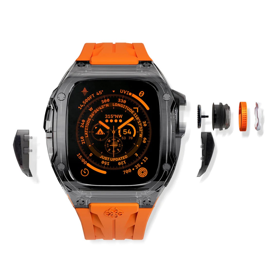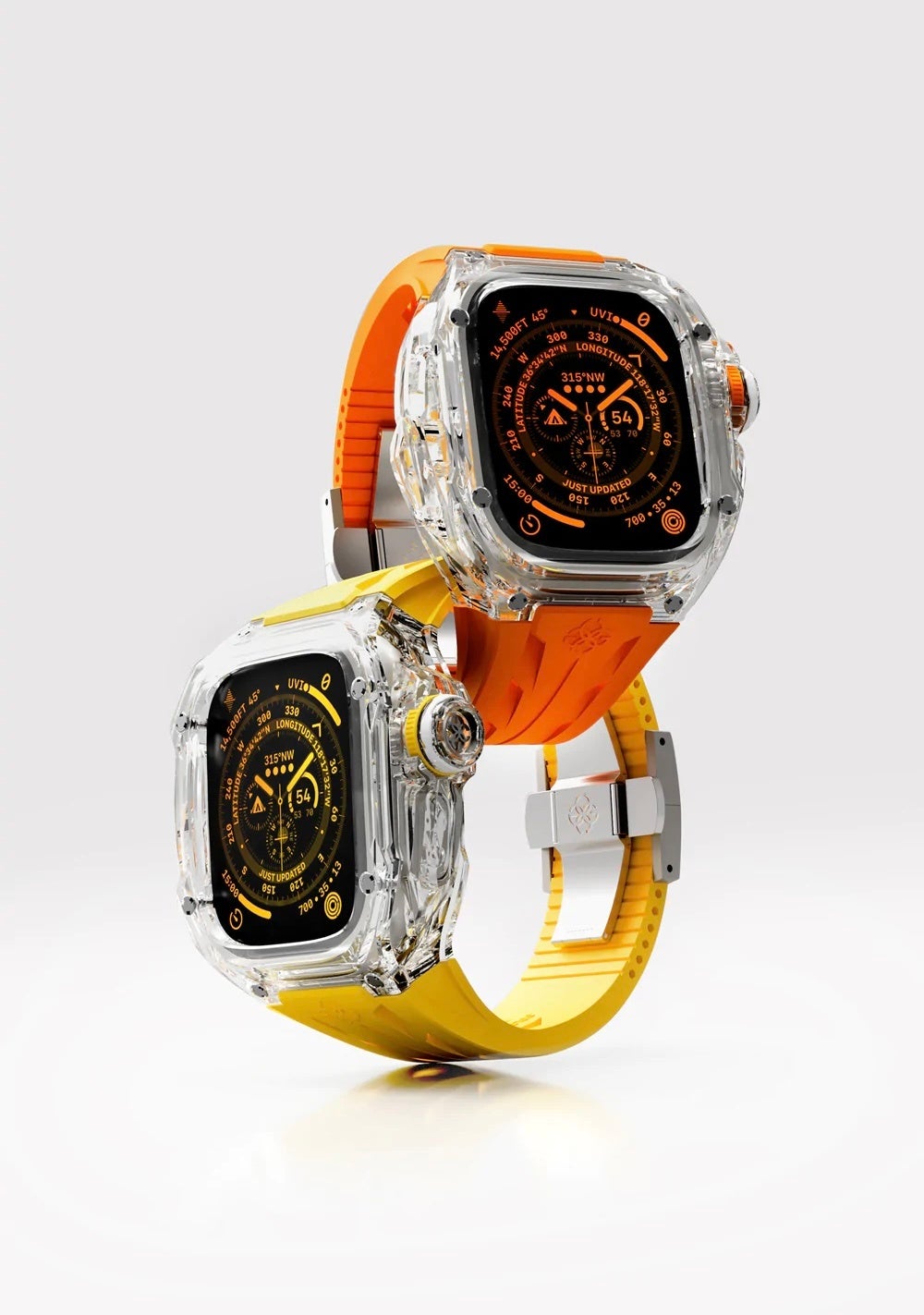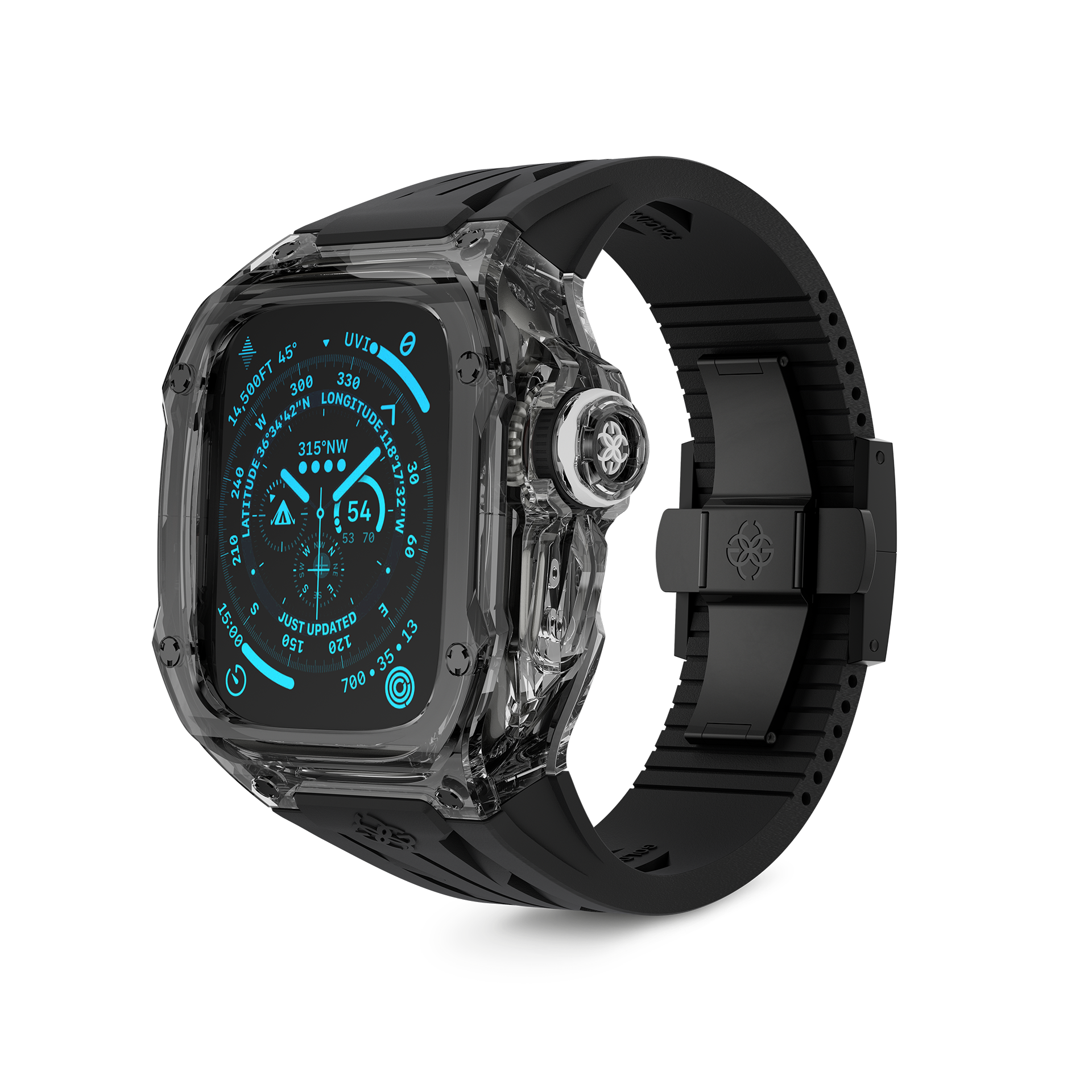 ゴールデンコンセプトの熟練した職人が、これまでに作成された中で最も頑丈で耐久性のあるApple Watchケースを開発しました。 これまでチタン製だった複雑なケースを透明なケースで表現することに成功し、シリコンやウレタンよりも耐久性が高く強靭なフルオロエラストマーを使用した新しいストラップを採用しています。