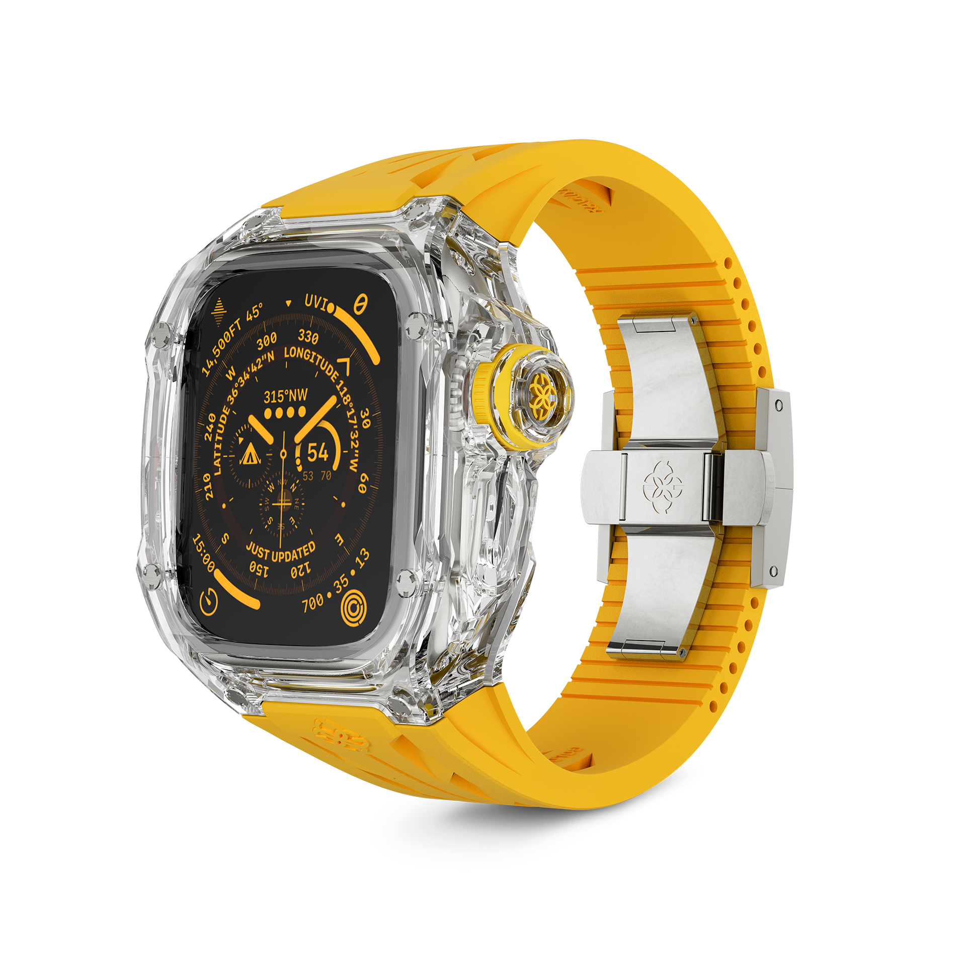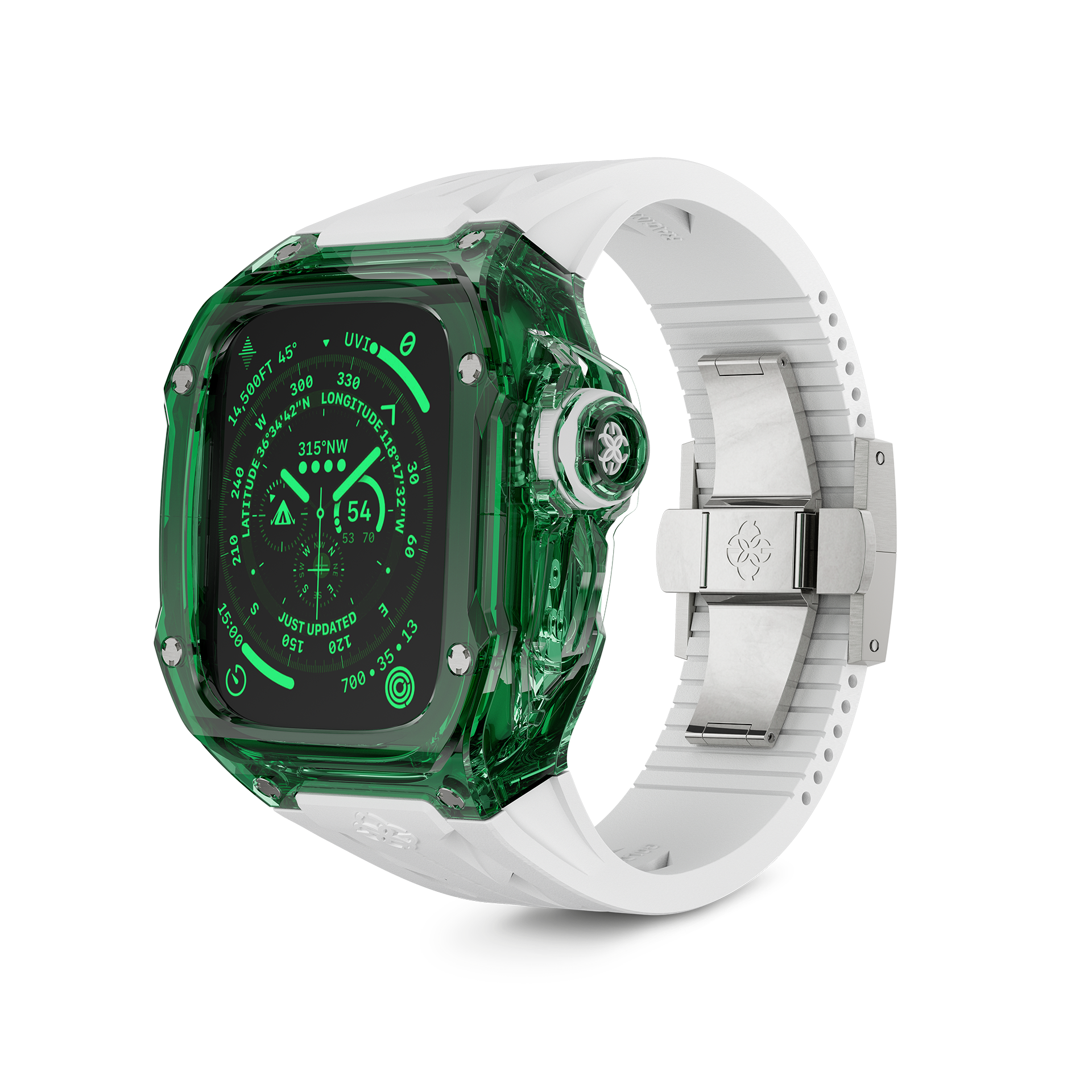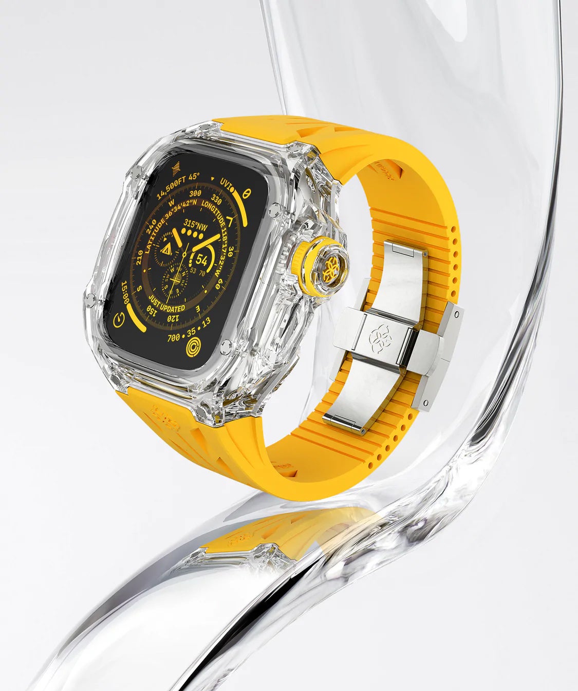 ゴールデンコンセプトの熟練した職人が、これまでに作成された中で最も頑丈で耐久性のあるApple Watchケースを開発しました。 これまでチタン製だった複雑なケースを透明なケースで表現することに成功し、シリコンやウレタンよりも耐久性が高く強靭なフルオロエラストマーを使用した新しいストラップを採用しています。