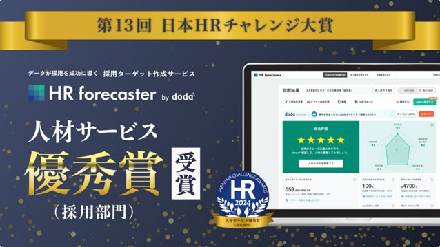今回、「人材サービス優秀賞(採用部門)」を受賞した「HR forecaster」は、転職サービス「doda」が蓄積してきた200万件以上のデータを活用し、転職市場に即した求人要件を作成できるサービスです。求人票における競合の平均提示年収や、求人ごとのターゲットとなる転職希望者などのデータを活用することで、最新の転職市場の動向を反映した求人票が作成でき、採用成功率の向上と中途採用活動の効率化に大きく貢献しています。