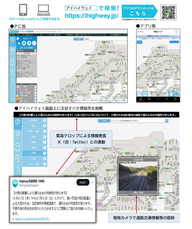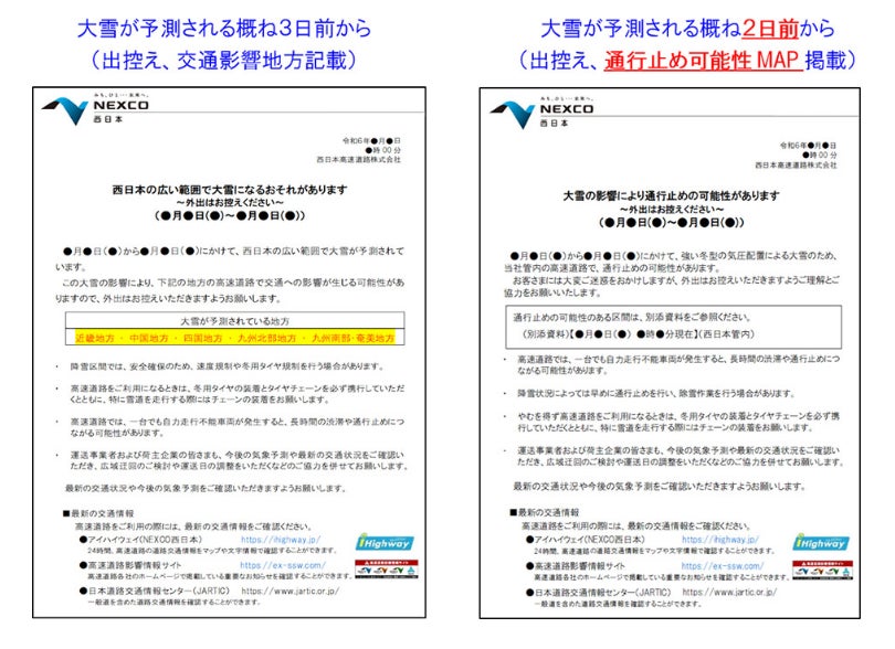 また、気象庁から「大雪に関する緊急発表」等が発表された場合には、上記と同様にホームページ等にて記者発表や通行止めの可能性のある区間などをお知らせするとともに、外出をお控えいただくこと等について情報を発信してまいります。