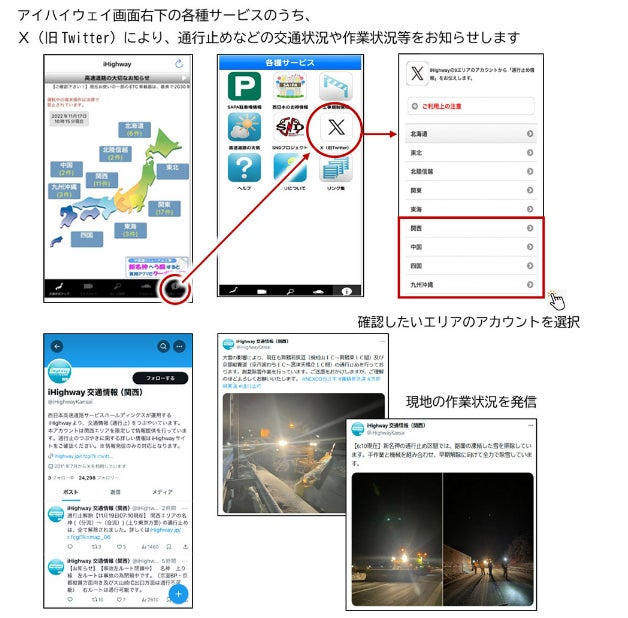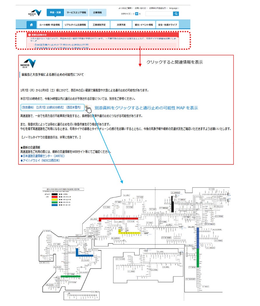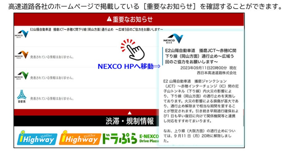 高速道路3会社の各ホームページで掲載している「重要なお知らせ」を確認することができます。
