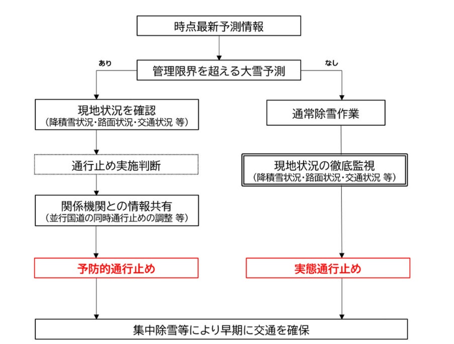 気象予測情報により大雪が予測される場合は、現地状況等を踏まえ、関係機関と調整のうえ予防的通行止めや並行国道との同時通行止めを実施します。なお、立ち往生車や滞留車が発生する前に躊躇ない通行止めを実施するため、以下のオペレーションを基本とします。
