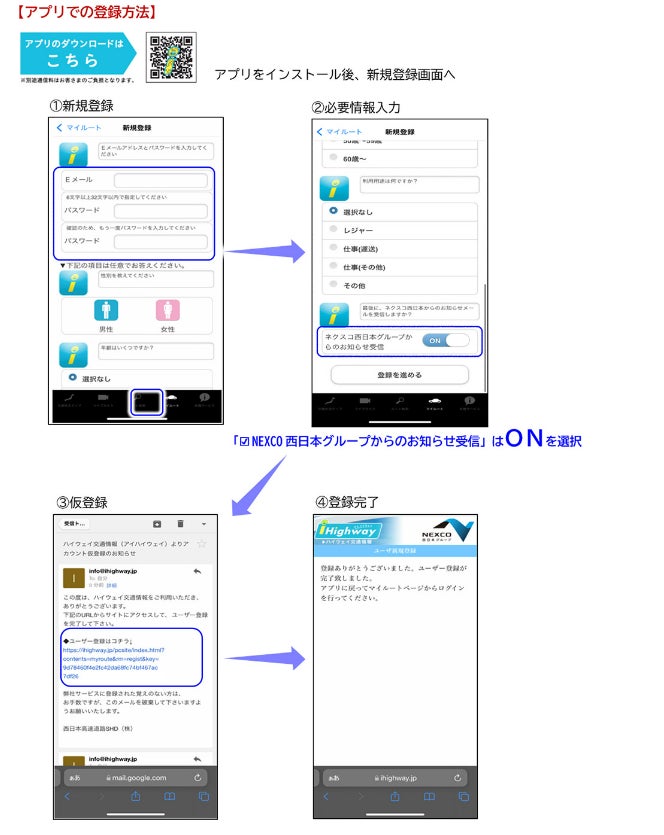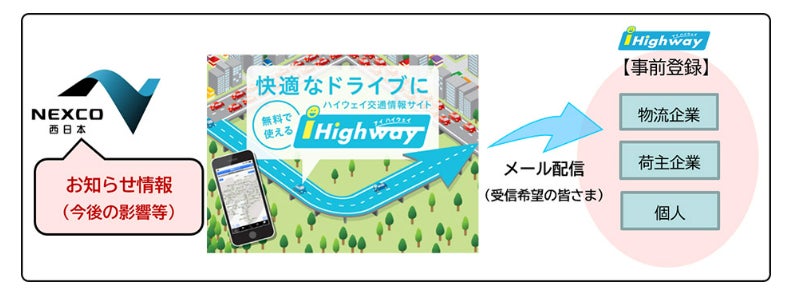 当社では、最新の気象予報に基づき、高速道路への影響について、公式WEBサイトで情報を提供するほか、アイハイウェイのユーザー登録者のうち、お知らせメール受信希望の皆さまへ、高速道路の通行止めの可能性などの「お知らせ」情報をメールにてお届けしますので、是非ご登録をお願いします。
