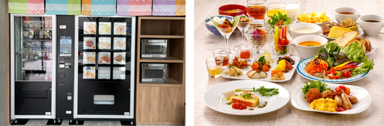 2階の朝食会場では、主に地元食材を使った和洋食ビュッフェを提供します。㈱グラノ24Kオリジナルのパンをはじめ、野菜を使ったスープやテリーヌなど素材の味を活かした料理をご準備しております。