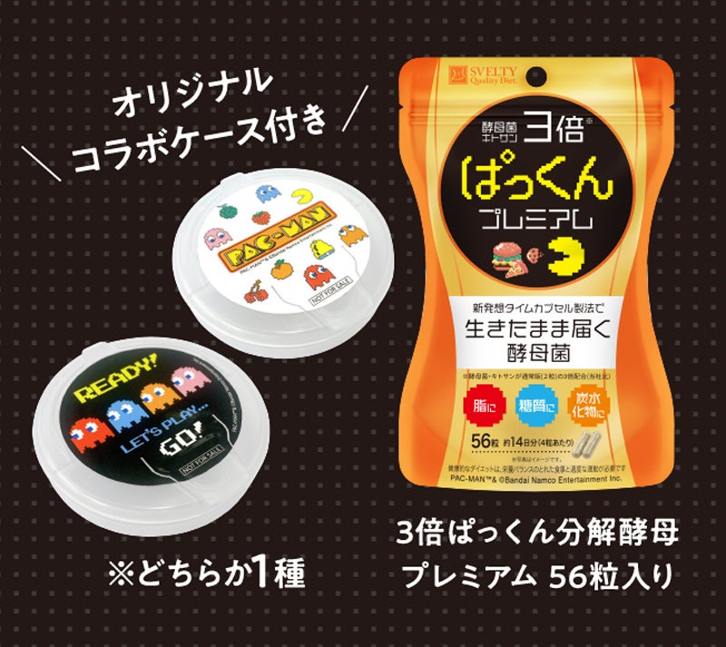 全ての賞品に「スベルティ 3倍ぱっくん分解酵母 プレミアム パックマンコラボ 56粒入り」が1袋と「携帯用オリジナルパックマンコラボケース」が1個付きます。