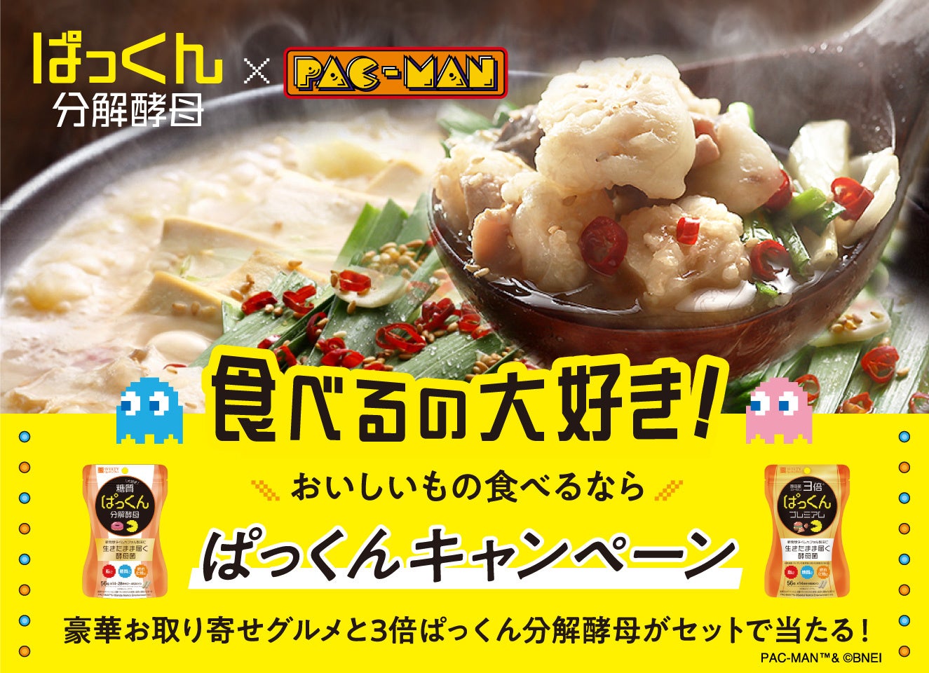 「ぱっくん分解酵母」と「パックマン」コラボを記念して「おいしいもの食べるならぱっくんキャンペーン」スタート!