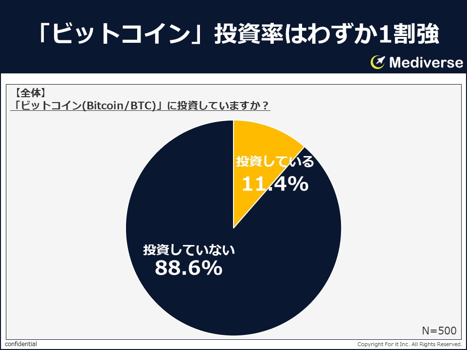 「ビットコイン(Bitcoin/BTC)」へ投資していると回答したのは、11.4%に留まっていた。