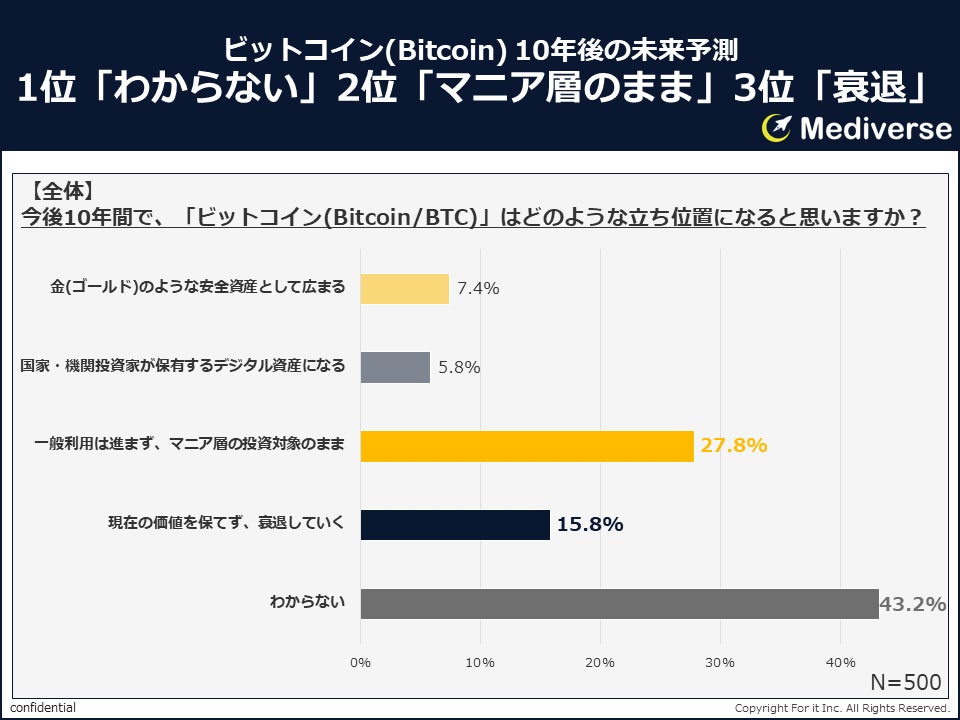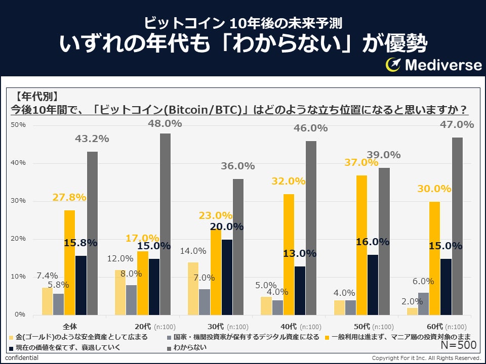 一方、「一般利用は進まず、マニア層の投資対象のまま」は50代をピークに年代が上がるごとに比率を伸ばしており、50代(37.0%)においては20代(17.0%)と2倍以上の差異があることからも、2009年の誕生から15年以上が経過しているとはいえ、年齢を重ねるにつれて、「ビットコイン(Bitcoin/BTC)」に対して堅実な見方をしていることが推察される。