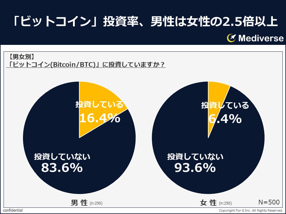 男女別に見ると、「ビットコイン(Bitcoin/BTC)」の投資有無には、ジェンダー差が見られていた。