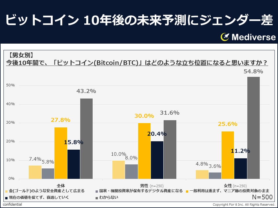 また、「金(ゴールド)のような安全資産として広まる」「国家・機関投資家が保有するデジタル資産になる」「現在の価値を保てず、衰退していく」という回答においては、いずれも男性は女性の2倍前後という結果が出ており、男性の方が女性に比べて、「ビットコイン(Bitcoin/BTC)」への期待と不安が大きいことが垣間見える。