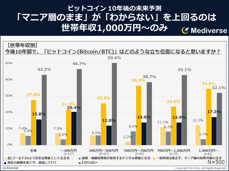 世帯年収別に見ると、「ビットコイン(Bitcoin/BTC)」の10年後の未来予測には、世帯年収差が見られた。
