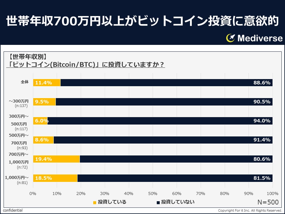 世帯年収700万円以上の世帯年収層は、「ビットコイン(Bitcoin/BTC)」への投資に意欲的であり、その投資率は他世帯年収層と比較すると2~3倍の差があることが見てとれる。