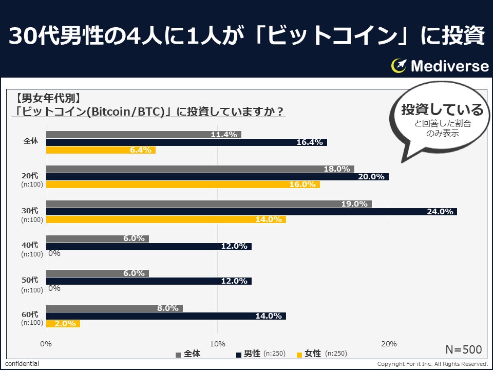 男女年代別に見ると、「ビットコイン(Bitcoin/BTC)」の投資有無には、全く異なる傾向が見られていた。