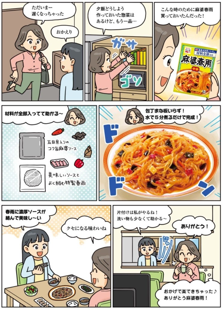 「永谷園の麻婆春雨♪」は知っていても食べる機会がなかったお客さまに、ぜひこの便利さとおいしさを知っていただきたい!との想いでデザインを一新しました。日々家事に追われる私たちにとって、食材を揃えたり切ったりする必要もなく、フライパンで5分煮るだけでごはんのおかずができるなんてとってもうれしいですよね♪