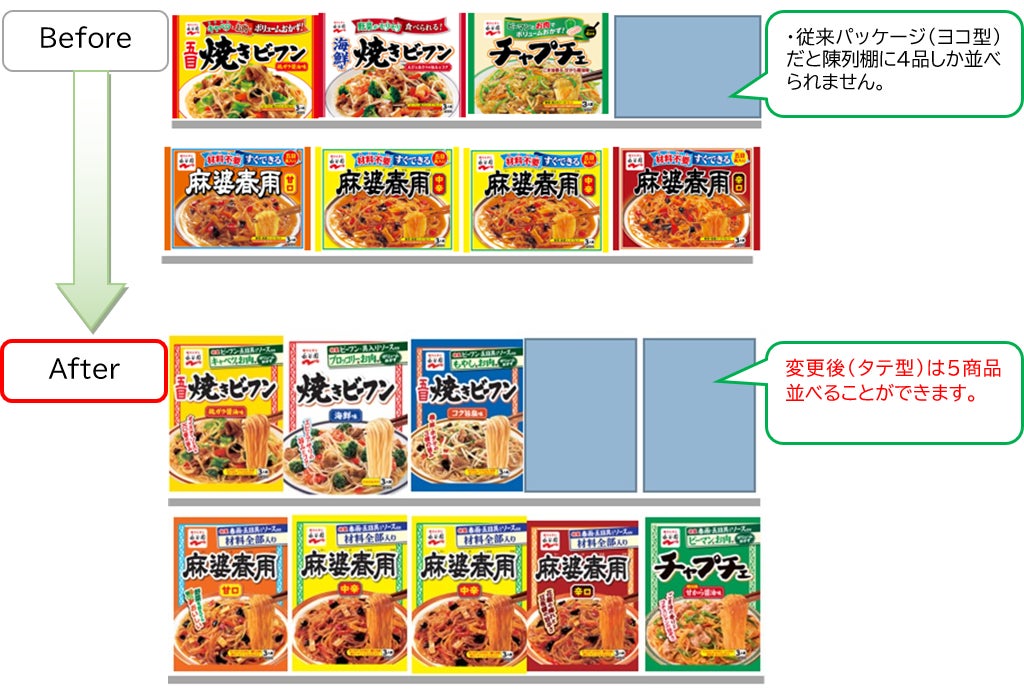 パッケージをタテ型に変更することで、プラス1商品(4→5品)陳列できるように!