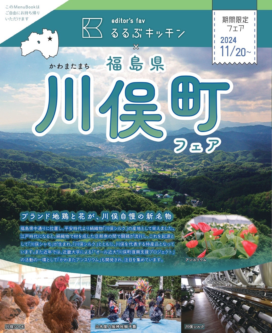 JTBグループで旅行 ・ライフスタイル情報を提供する、株式会社 JTB パブリッシング(東京都江東区、代表取締役 社長執行役員:盛崎宏行)は、紀伊國屋書店新宿本店の地下名店街に移転しリニューアルオープンする直営飲食店「editor’s fav るるぶキッチン」(以下「るるぶキッチン」)において、2024年11月20日~12月29日までの期間限定で「るるぶキッチン×福島県川俣町」特集フェアを実施します。