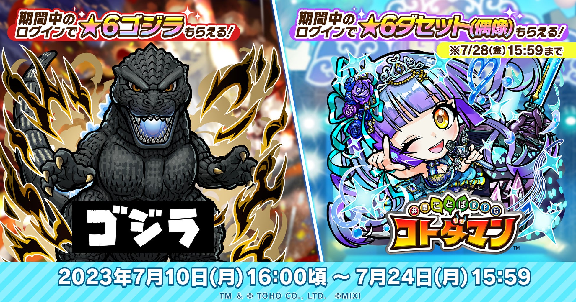 ●コトダマンの恒例サマーフェスタ「ゴッドインジャパン」にゴジラが襲来! ●「コトダマンアワード2022」レジェンド化人気投票第1位「ダセット」が 「GIJ2023召喚」に本日7月8日(土)より登場!