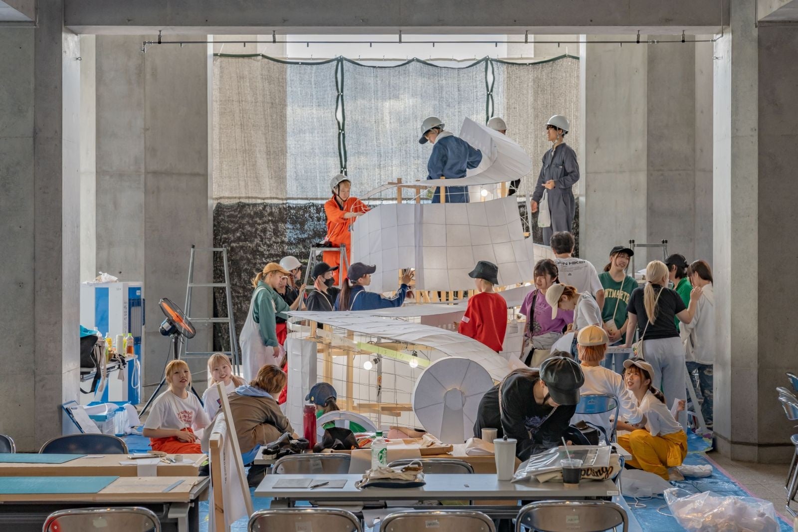 巨大な“ねぶた”は、京都芸術大学の1年生が履修する『クリエイティブワークショップ』の成果です。12学科の学生が横断的に参加する混成のクラスは全部で20クラス。1クラス約35名のなかでコミュニケーションを深め切磋琢磨し、12日間という短期間でのねぶた制作完成を実現します。