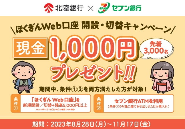 北陸銀行(頭取 中澤 宏)は、2023年8月28日(月)より株式会社セブン銀行とタイアップした「北陸銀行×セブン銀行 ほくぎんWeb口座開設・切替キャンペーン」を実施いたします。期間中に、「ほくぎんWeb口座」を新規開設または通帳から切替の上、セブン銀行ATMをご利用いただいたお客さまを対象に、先着3,000名に現金1,000円をプレゼントいたします。