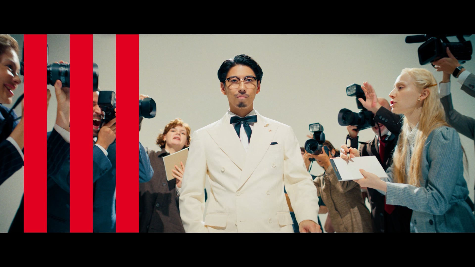新CMは、カーネル・サンダースに扮した俳優の賀来賢人さんが、多くの記者に注目される中、演台に堂々と歩いていく姿から始まります。「あなたはまだ、チキン専門店の竜田バーガーを知らない。」という印象的なナレーションに続き、「ついに、誕生。」「竜田バーガーは、新時代へ。」といったメッセージ。KFCが約8年かけて開発した、鶏竜田バーガーのジューシーな断面が画面いっぱいに広がります。
