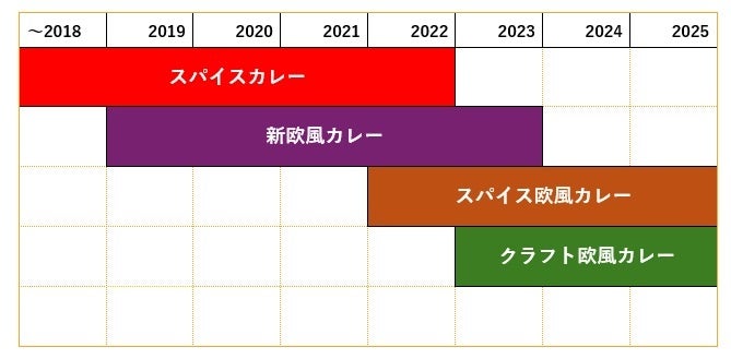 2023年になると、スパイスカレーと新欧風カレーの良い部分を融合させた「スパイス欧風カレー」がブームとなり、多くの人々の関心を集めました。そして2024年には、さらに質を追求した「クラフト欧風カレー」が登場し、職人の技が光るカレーとして大きな注目されています。