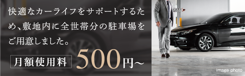 敷地内に全世帯分の駐車場をご用意しました。月額使用料は500円~※と、使用しやすい価格設定とすることで休日のレジャーや日々の通勤など快適なカーライフをサポートします。