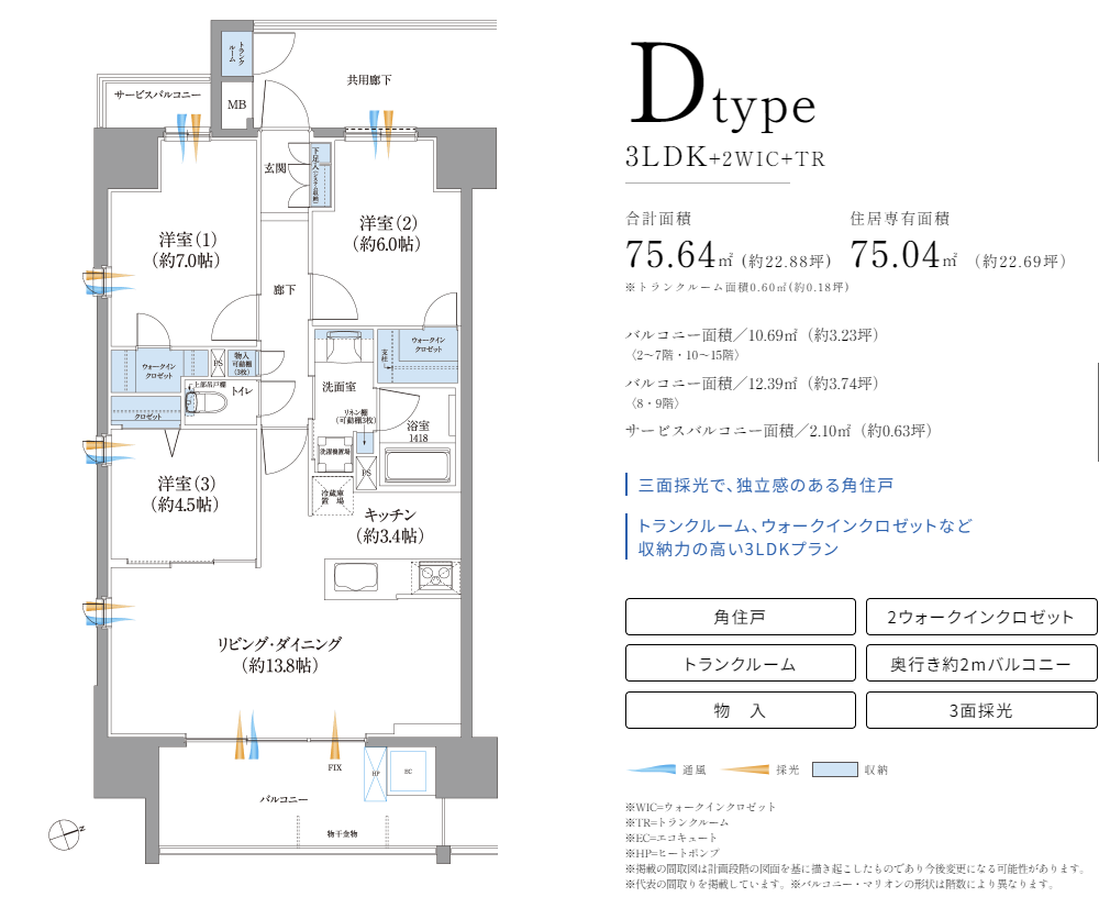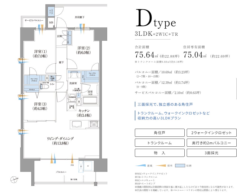 全邸3LDK。角住戸のA・Dタイプには、玄関側にトランクルームを設けることでさらなるゆとりをもたらしました。