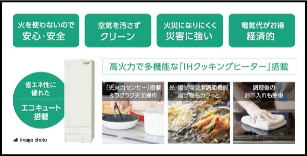 高効率給湯システム、エコキュートやIHクッキングヒーターなど電化機器を設置したオール電化マンション。火を使わないので安全でクリーン、さらにLPガスが主流の岩国市内においては経済的な暮らしを実現します。
