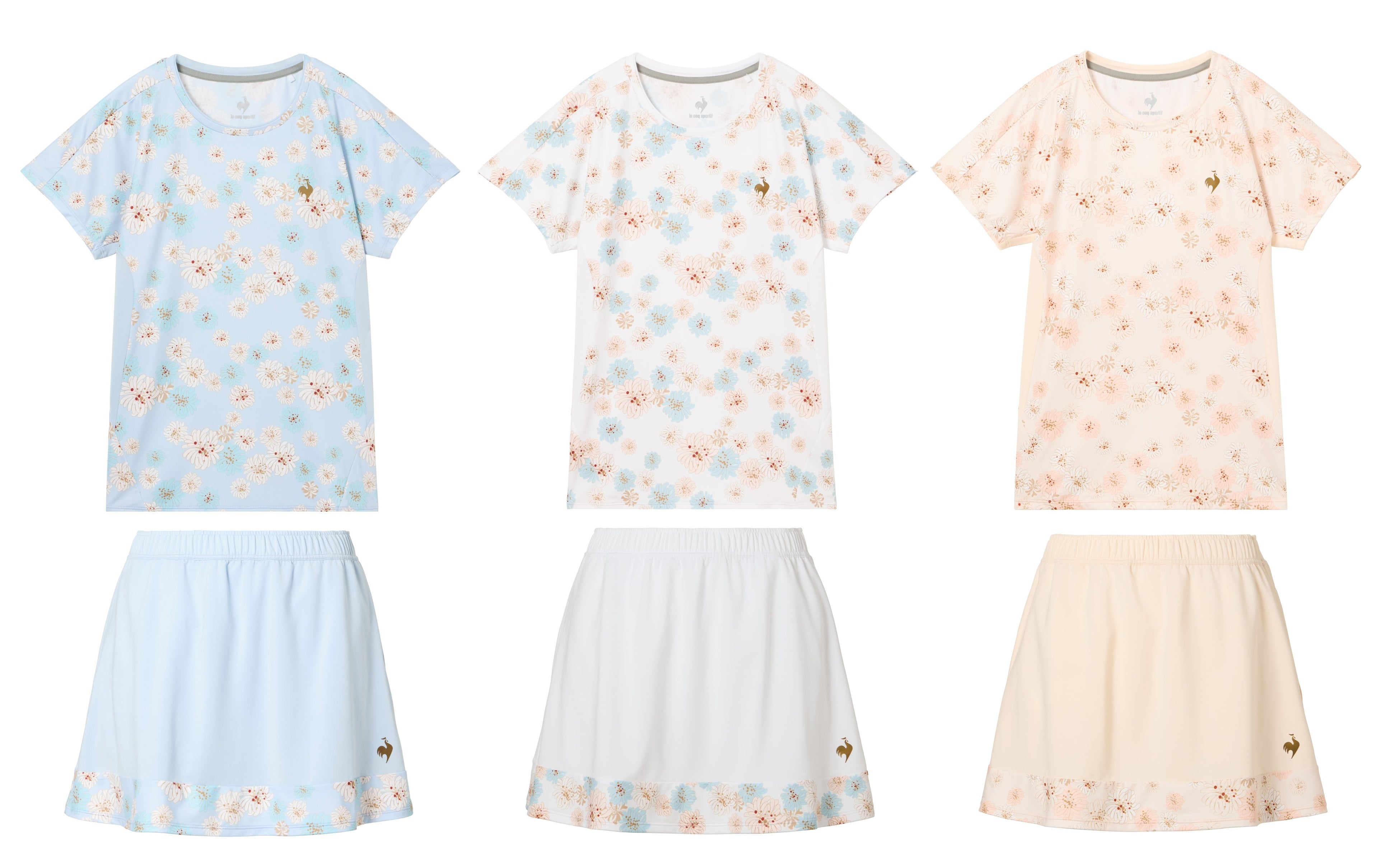 「クリザンテーム」を散らした華やかなデザインと、柔らかくストレッチ性に優れた素材が特徴のテニスウェアです。ゲームシャツには肩回りの動きに着目した独自のパターンや消臭テープを採用し、テニスに適した機能性をもたせています。いずれもJTA(日本テニス協会)の定めるウェア規定を満たしているので公式試合でも着用できます。