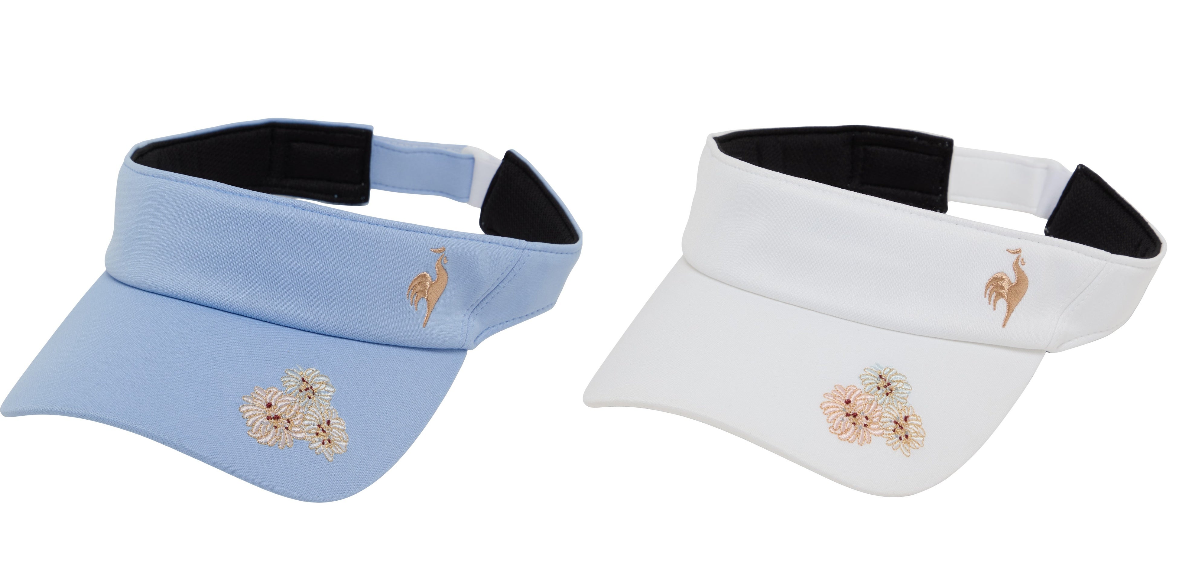 「クリザンテーム」を庇部分にあしらった上品な印象のサンバイザーです。額に接する部分に抗菌防臭・吸汗速乾性のある素材を採用したテニスのプレー時におすすめのアイテムです。
