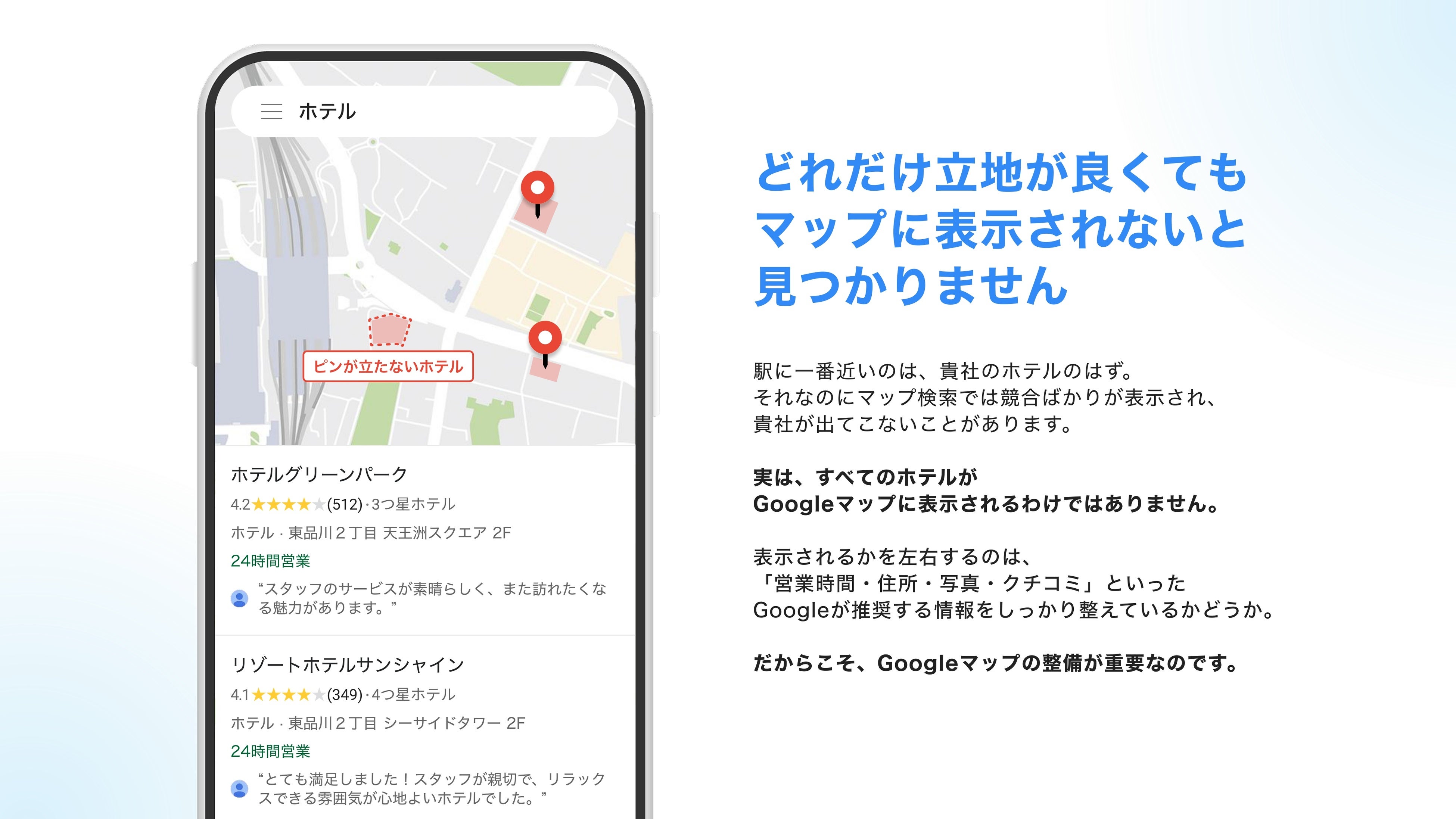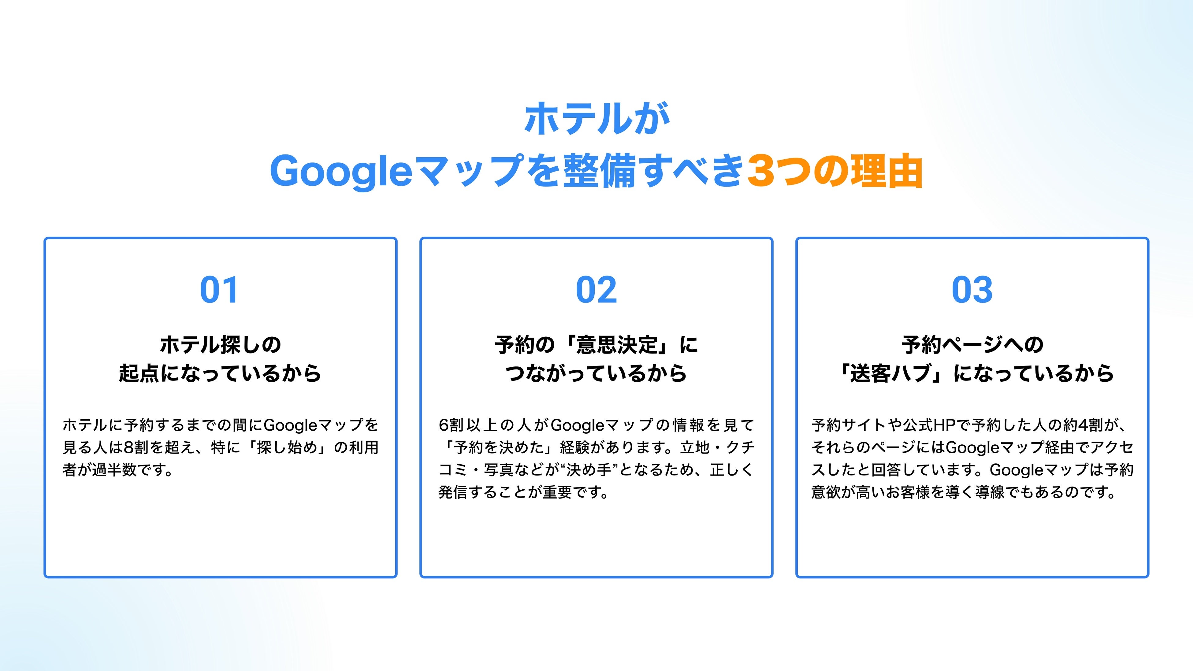 近年、ホテル探しにGoogleマップを使用する人が増えており、いかにマップを整備するかが重要になっています。