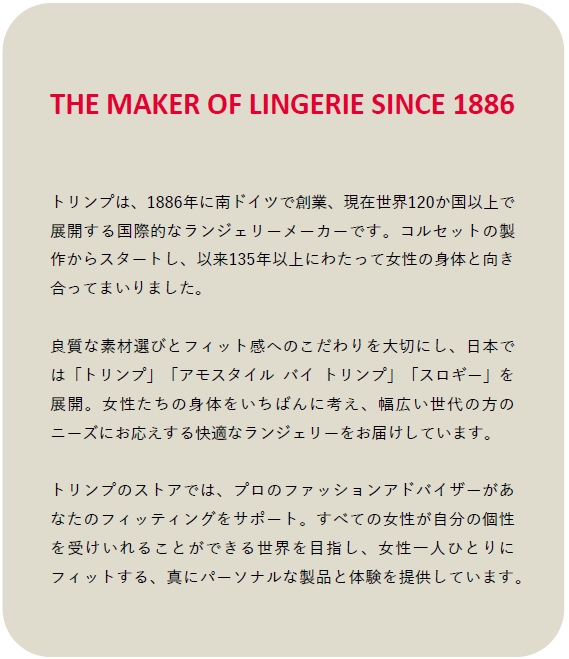 トリンプが2022年より発信している「It’s Personal」というブランドメッセージ。それはお客様一人ひとりの個性を尊重するという、ブランドが創設当初から大切にしてきた想いであり、全ての人がもっと自由で、もっと心地よく毎日を過ごせるようにというブランドの願いが込められています。ランジェリーは非常にパーソナルなもの。だからこそ店頭でのショッピング体験をより快適なものにしようとトリンプは常々考え、努力してまいりました。
