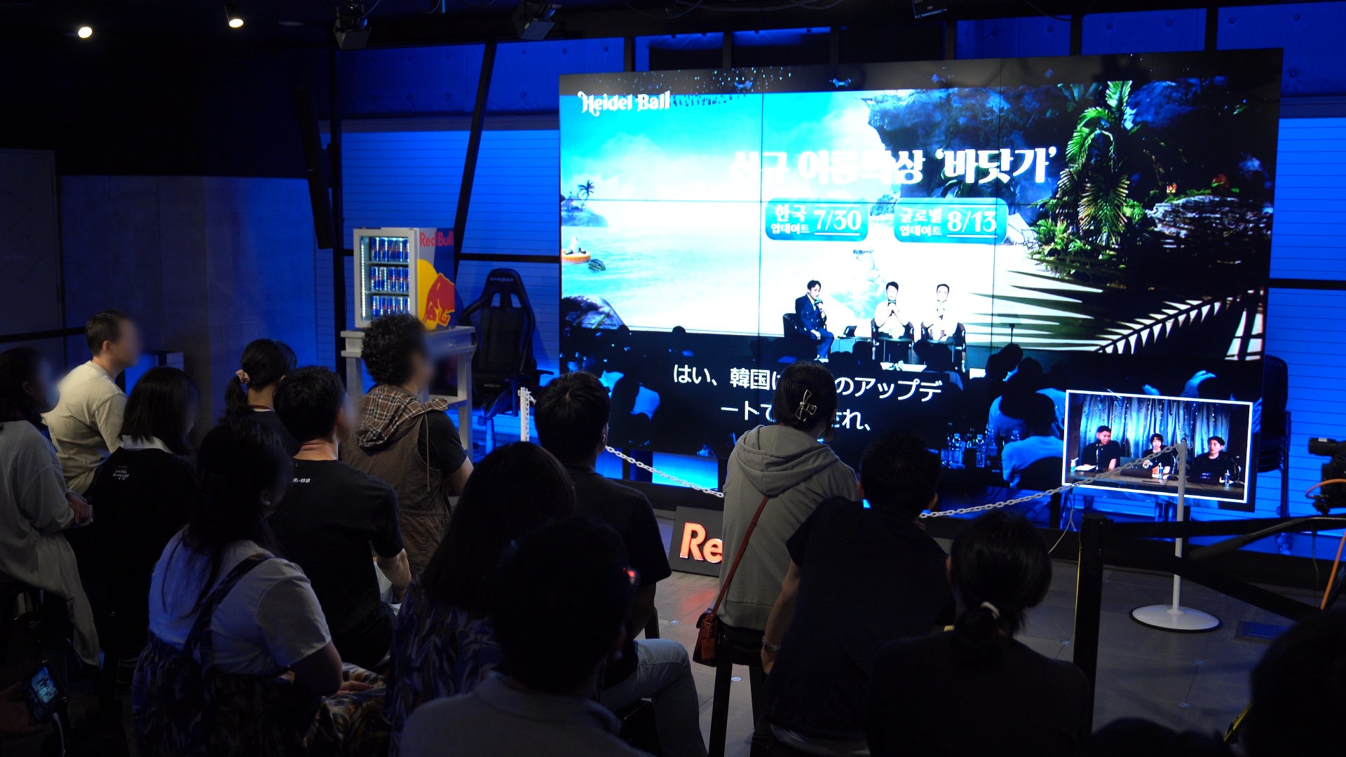 昨年の「黒い砂漠モバイル 2023 カルフェオン宴会」に続き、今年も東京都中野区の「Red Bull Gaming Sphere Tokyo」でパブリックビューイングが開催されました。中継放送の現場には、多くの冒険者様が招待され、共に交流する場となりました。特に、芸術祭コーナーでは、全世界の冒険者様が応募した作品の中からリアルタイム投票で日本の冒険者様の作品が多数選ばれ、大きな歓声が上がり、会場は熱気に包まれました。
