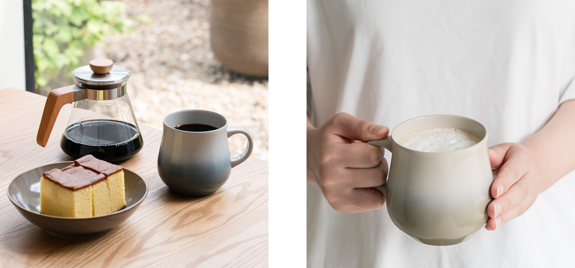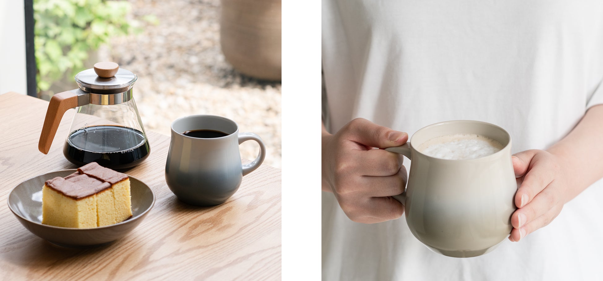 汚れがするっと落ちやすく、KEYUCAで販売されている他の食器とも相性のいいデザインに落とし込んだ「陶器のような真空断熱マグ」で普段の食卓をはじめ、オフィスシーンやブレイクタイムなどの様々なシーンでご活用ください。