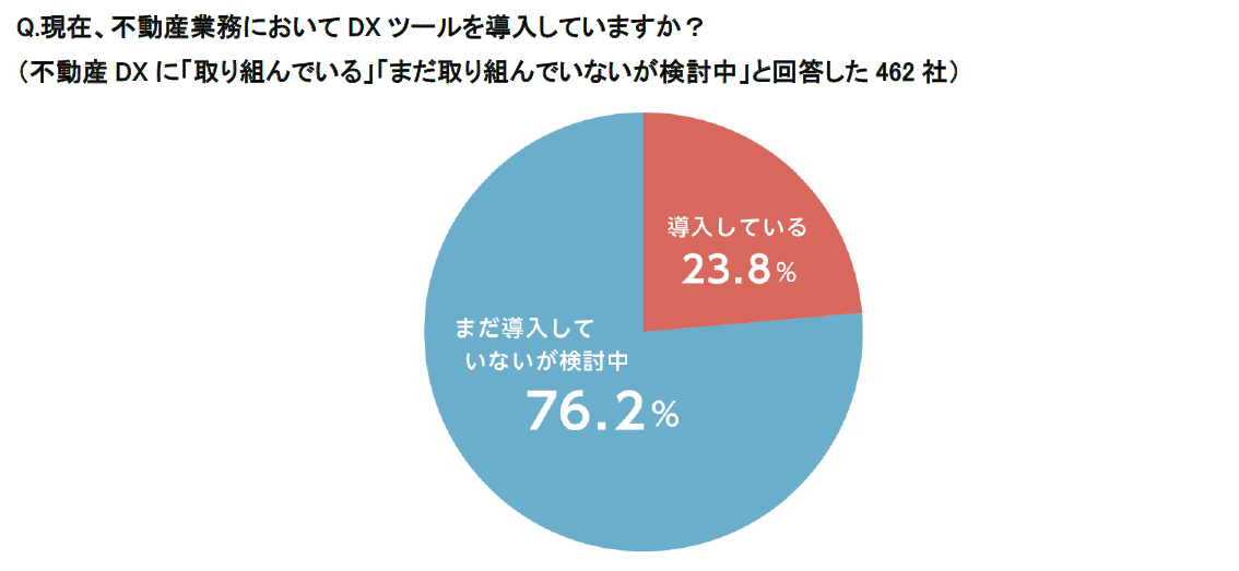DXツールを導入している不動産会社は約2割でした。一方で、「まだ導入していないが検討中」と回答した不動産会社は7割以上となりました。